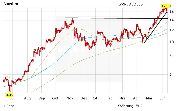 Die Aktie von Nordex kam am Dienstag etwas unter Druck. Anleger sollten sich davon aber nicht aus der Ruhe bringen lassen, schließlich ist das Papier nach dem starken Kaufsignal mit dem Ausbruch über die charttechnisch wichtige Marke von 14,50 Euro bis auf 17,00 Euro nach oben gelaufen. Aus technischer Sicht wäre natürlich ein Rücksetzer auf die Ausbruchslinie vorteilhaft.
