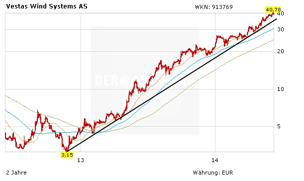 Jedoch legt Nordex in den letzten Wochen eine derartige Relative Stärke an den Tag, dass dieses Szenario wohl wenig wahrscheinlich erscheint. Hier hilft ein Blick auf den Chart von Konkurrent Vestas: die Aktie markiert in schöner Regelmäßigkeit neue Höchstkurse. Stärkere Rücksetzer sind dabei in den letzten Wochen gar ausgeblieben. Es bleibt dabei: Schwache Tage bleiben bei der Aktie von Nordex Kauftage. Vestas dagegen ist ein Halteposition.