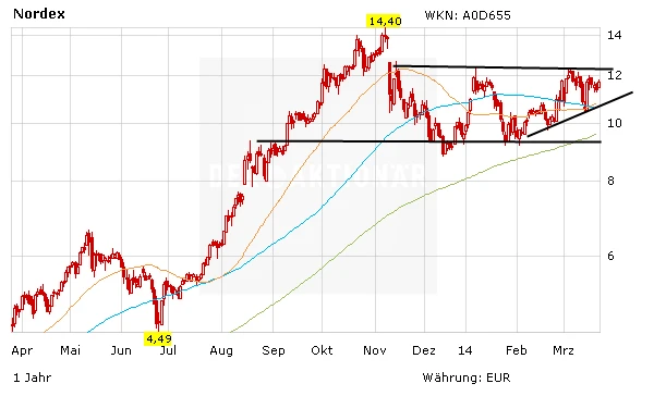 Spannung verspricht nach wie vor die Aktie von Nordex. Allein aufgrund der Tatsache, dass der Hersteller von Windenergieanlagen gegen Montagmittag seine Bilanz-Pressekonferenz zum Jahresabschluss 2013 halten wird. Im Anschluss findet eine Analysten-Konferenz statt. Dabei wird sich Nordex-Vorstand Jürgen Zeschky sicherlich auch zum Verlauf des laufenden Jahres äußern.