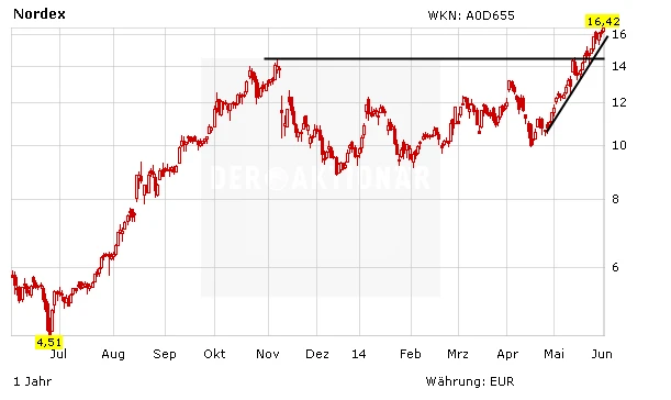 Nachdem Nordex über den Widerstand bei rund 14,50 Euro geklettert war, hat die Aktie ein starkes Kaufsignal generiert. Zügig ging es daraufhin weiter nach oben bis auf zuletzt 16,39 Euro. Nach der starken Performance in den vergangenen Tagen gehört das Papier im Wochenvergleich zu den Top-3-Werten des TecDAX. In einem weiterhin freundlichen Gesamtmarkt dürfte die Nordex-Aktie in den kommenden Wochen ihren Aufwärtstrend fortsetzen und direkt bis zur 20-Euro-Marke durchstarten können. Investierte Anleger geben kein Stück aus der Hand.
