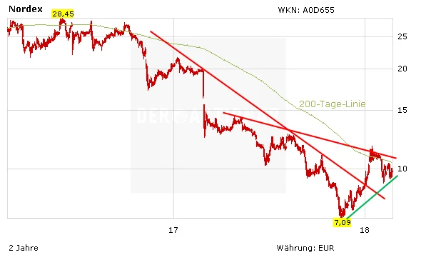 Der Nordex-Aktienkurs zog am Mittwoch zeitweise auf 10,04 Euro an und nähert sich damit erneut der 200-Tage-Linie, die aktuell bei 10,43 Euro verläuft. Im Januar war ein erster Versuch gescheitert, diese wichtige Zone zu überschreiten. Im Anschluss rutschte die Aktie in volatilem Umfeld in der Folge nochmals bis 9,03 Euro ab. Wenn der junge Aufwärtstrend seit November - derzeit bei 9,33 Euro - nicht nachhaltig unterschritten wird, könnte es schon bald zum Aufschwung über die 11-Euro-Marke hinaus kommen - mit viel Luft nach oben. Die Turnaround-Bewegung muss allerdings durch fundamentale Fakten - sprich weitere Aufträge für Windkraftanlagen - untermauert werden.