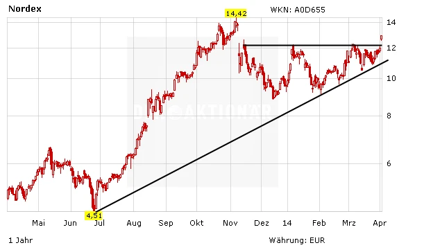 Die Auftragsbücher bei Nordex sind voll und der Druck von Seiten der Politik lässt nach. Mit dem Ausbruch über den Widerstand bei 12,20 Euro ist der Weg in den Bereich des letzten Hochsbei 14,40 Euro frei. Danach sind auch höhere Kurse denkbar. Investierte Anleger lassen ihre Gewinne laufen.