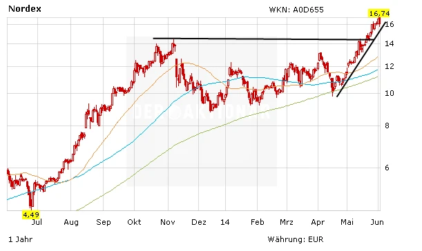 Der Aktienkurs habe mit rund 16 Euro den Höchstkurs der letzten Monate erreicht. Nordex erwartet nun ein Auftragseingang von 1,5 bis 1,7 Milliarden und einen Umsatz von 1,5 bis 1,6 Milliarden Euro erwartet. Die Ebit-Marge für 2014, also das Verhältnis von operativem Ergebnis zum Umsatz, werde laut Zeschky zwischen vier und fünf Prozent liegen. „Die Zahlen waren sehr gut und lagen deutlich über unseren und den Markterwartungen. Von daher bin ich sehr zufrieden mit dem Q1“ sagt Analyst Alexander Drews von Montega gegenüber dem AKTIONÄR. Der Experte geht sogar noch einen Schritt weiter. „Nordex dürfte in den kommenden Quartalen an die Erfolge aus Q1 anknüpfen. Hierfür sprechen das prall gefüllte Orderbuch und die Verlagerung des Geschäfts auf profitablere Projekte“, sagt Drews.