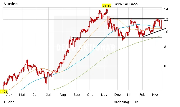 Die Nordex-Aktie legte zu Wochenbeginn los wie die Feuerwehr. Mehr als zehn Prozent ging es mit dem Papier nach oben. Die Krise in der Ukraine spielt dem Hersteller von Windenergieanlagen in die Karten. Gut möglich, dass sich Politiker mehr Gedanken über den zukünftigen Energie-Mix in Deutschland machen müssen, schließlich ist die Abhängigkeit von Öl und Gas aus Russland erdrückend.