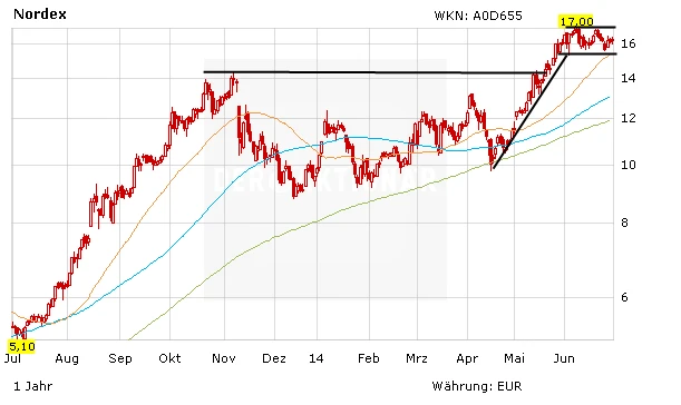 Es bleibt dabei: Charttechnisch sieht es für die Aktie von Nordex weiterhin gut aus. Der positive Newsflow sollte in den nächsten Monaten anhalten. Mit einem Ausbruch über die Marke von 17 Euro sollte die Aktie durchaus bis in den Bereich von 20 Euro vordringen können.