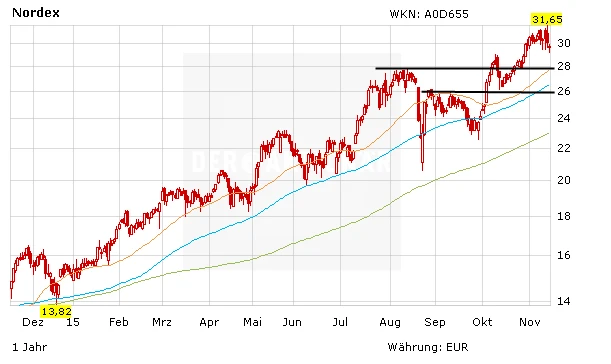Nordex hat in der abgelaufenen Börsenwoche mit guten Zahlen und einem guten Ausblick bis 2018 geglänzt. Die Aktie hat im Anschluss den Sprung über die wichtige Marke von 30 Euro geschafft. Im Anschluss haben viele Experten ihre Kursziele bestätigt. Alexander Karnick von der Deutschen Bank sieht 31 Euro. Die Bilanz des Windkraftanlagenherstellers für das dritte Jahresviertel sei stark ausgefallen und die neuen Umsatzziele kämen wie erwartet. Commerzbank-Analyst Sebastian Growe sah die Zielvorgaben klar über den Erwartungen. Der nach dem geplanten Kauf des Windgeschäfts von Acciona angestrebte Umsatz von bis zu 4,5 Milliarden Euro in den kommenden Jahren übertreffe selbst die optimistischsten Erwartungen von 4 Milliarden Euro.