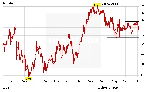 Aus charttechnischer Sicht befindet sich die Aktie von Nordex seit einigen Wochen in einer Seitwärtsbewegung. Ein klares positives Signal würde der Sprung über die Marke von 14,80 Euro liefern. Fundamental ist derweil alles im Lot. Nordex-Vorstand Jürgen Zeschky will die Expansion voran treiben, neue Märkte wie Afrika erobern. Die Jahresziele bis 2017 wurden konkretisiert. Spätestens dann will der Vorstand will mit seinem Team knapp zwei Milliarden Euro erlösen. Die EBIT-Marge soll dabei weiter zulegen.