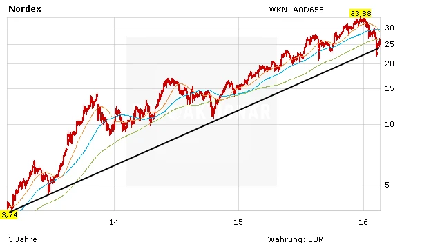 Die Nordex-Aktie ist und bleibt einer der spannendsten Nebenwerte auf dem deutschen Kurszettel. Mit einem KGV für 2016 von aktuell 18 und nach wie vor hervorragenden Wachstumsaussichten ist das Potenzial der Aktie noch lange nicht ausgereizt. 40 Euro sind in einem freundlichen Gesamtmarkt im laufenden Börsenjahr durchaus drin.