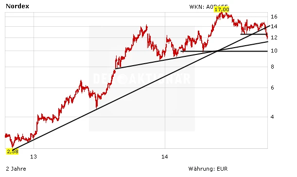 Seit Dezember 2012 marschierte die Nordex-Aktie nach oben. Dieser langfristige, steile Aufwärtstrend ist gebrochen. Zuletzt ist der Kurs zudem unter den wichtigen Bereich um 12,50 Euro gefallen. Durch die Verluste der vergangenen Tage rückt nun zunehmend der mittelfristige, flache Aufwärtstrend bei rund 11,50 Euro in den Fokus der Anleger. Bricht auch diese Unterstützung, droht ein weiterer Abverkauf, der im schwachen Gesamtmarkt sogar die 10-Euro-Marke in Gefahr bringen könnte.