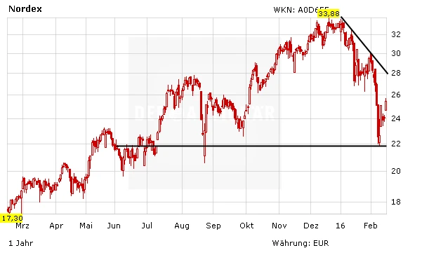 Von den 17 Experten, die sich regelmäßig mit den Nordex-Papieren befassen, raten aktuell acht zum Kauf. Sechs Analysten stufen die Aktie mit Halten ein, drei empfehlen Anlegern den Verkauf. Das durchschnittliche Kursziel beläuft sich nun auf 33,65 Euro, was satte 33 Prozent über dem jetzigen Kurs von 25,33 Euro liegt.