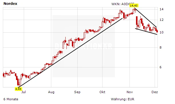 Die Nordex-Aktie hat heute die 10,00 Euro-Marke von oben nach unten durchstoßen. Offensichtlich lagen in diesem Bereich jede Menge Stoppkurse. Der Abwärtstrend hat sich damit beschleunigt. Und die Aktie ist mittlerweile der größte Verlierer im TecDAX.