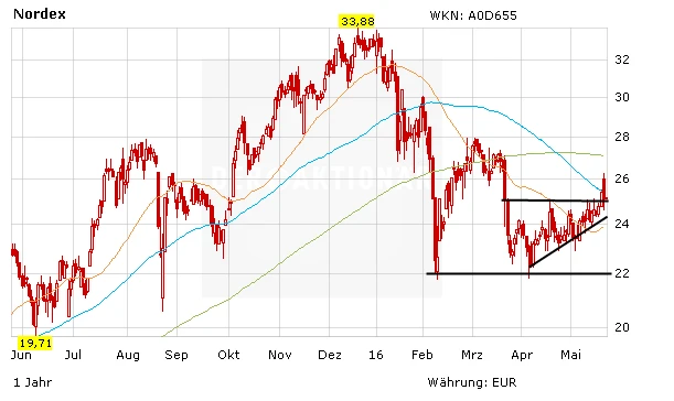 Fazit: Lange sah es technisch ganz und gar nicht gut aus für die Nordex-Aktie. Mehr als zwei Monate war Nordex zwischen 22,50 und 24,50 Euro gefangen In den letzten Handelstagen hat das Papier endlich den Ausbruch über die Widerstandslinie von 24,50 Euro geschafft. Damit hat sich ein neues Kaufsignal ergeben. Als nächstes wird die Aktie nun die Marke von 27,50 Euro ins Visier nehmen. Wer investiert ist, gibt kein Stück aus der Hand!