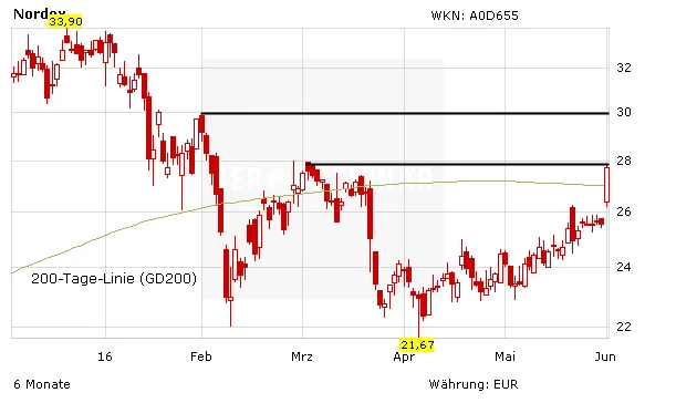 Nordex zählte gestern zu den absoluten Top-Performern auf dem heimischen Kurszettel. Es gab eine Reihe von Impulsgebern. Mit dem Sprung über die 200-Tage-Linie hat die TecDAX-Aktie ein Kaufsignal generiert. Hält die Dynamik an, dürfte die 30-Euro-Marke ins Visier genommen werden.