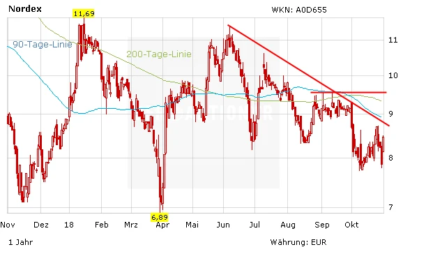 Am Markt sind die Worte Labsal für die geschundenen Börsianerdepots. Die Nordex-Aktie springt zeitweise um rund acht Prozent auf 8,60 Euro, nachdem sie gestern noch bis 7,77 Euro abgerutscht war. Charttechnisch ist der SDAX-Wert aber noch nicht aus dem Gröbsten raus. Eine Abwärtstrendlinie seit Juni verläuft derzeit bei 8,80 Euro, bei 9,34 Euro verläuft zudem die 90-Tage-Linie. Erst ein nachhaltiger Ausbruch über diese Zone, besser noch über 9,50 Euro, würde das Chartbild von Nordex verbessern. Solange bleibt die Aktie auf der Watchlist. Lediglich kurzfristige Trading-Chancen ergeben sich immer wieder.
