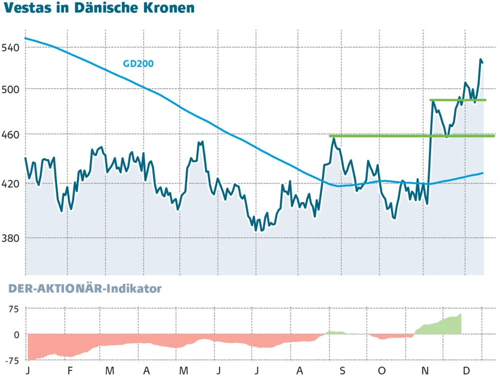 Nach einer monatelangen Konsolidierung ist die Vestas-Aktie getrieben durch die positive Auftragsentwicklung sowie die Aussicht auf stabilere Preise über die Widerstandszone bei 460 Dänische Kronen nach oben ausgebrochen. Zuletzt hat die Aufwärtsbewegung an Dynamik gewonnen. Wer Vestas-Aktien im Depot hat, bleibt dabei. Neueinsteiger sollten Rücksetzer abwarten. Bei der Nordex-Aktie ist hingegen weiterhin Geduld gefragt.
