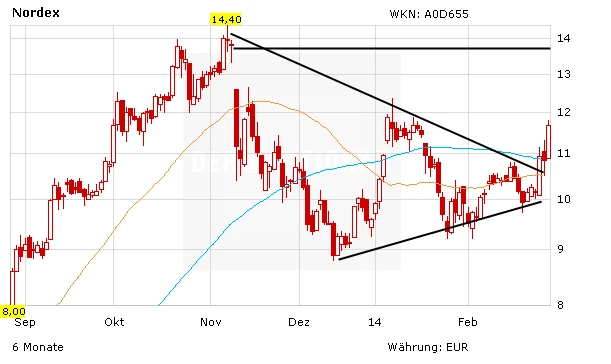 Der Höhenflug der Nordex-Aktie setzt sich fort. Am Freitag gewinnt das Papier fast zehn Prozent. Es wurde ein charttechnisches Dreieck verlassen und die 38- und 90-Tage-Linie deutlich geknackt. Jetzt hat das Papier aus charttechnischer Sicht Luft bis zum Schließen des GAPs bei 13,50 Euro. Das Ziel des AKTIONÄR liegt bei 14,50 Euro.