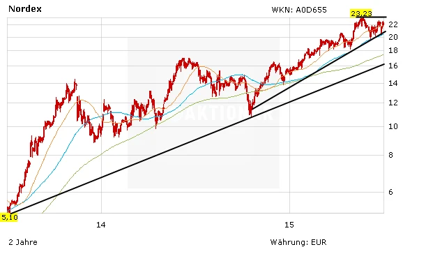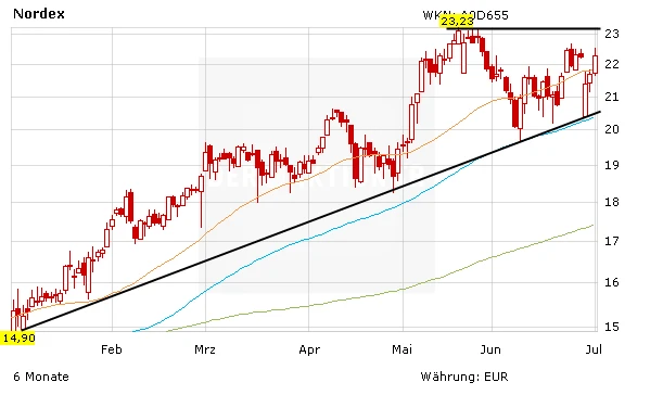 Die Aktie von Nordex kann sich den derzeitigen unruhigen Märkten nahezu entziehen. Nach einem kurzen Rutsch bis knapp 20 Euro hat sich das Papier schnell wieder bis auf rund 23 Euro nach oben gearbeitet. Jeder Schwächeanfall wird demnach von den Anlegern sofort wieder mit Käufen beantwortet.
