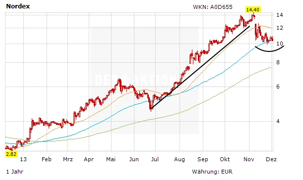 Technisch betrachtet hat sich die Lage bei der Nordex-Aktie aufgehellt. Nachdem die Unterstützung durch die 90-Tage-Linie gehalten hat, zog das Papier wieder bis auf knapp 10,70 Euro an. Dabei könnte sich eine Untertasse ausbilden. Die Wahrscheinlichkeit auf steigende Kurse in den nächsten Wochen sind jedenfalls wieder gestiegen.