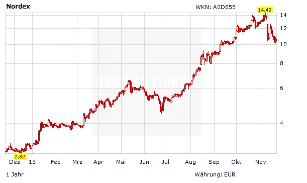Die Experten von Börse Online verweisen auf die Absichten deutscher Politiker von CDU/CSU und SPD, die Förderung von Strom aus erneuerbaren Quellen zu senken. Von diesen Plänen wären Windkraftanlagen im Norden Deutschlands besonders betroffen. Das auf Windkraftanlagen spezialisierte Unternehmen Nordex überzeugte allerdings mit den Zahlen für das dritte Quartal des laufenden Jahres und übertraf die Schätzungen der Analysten deutlich. Vorstandsvorsitzender Dr. Jürgen Zeschky bestätigte zudem die Umsatz- und Gewinn-Ziele für das Gesamtjahr und erhöhte die Prognose für den Wert der eingehenden Aufträge um 100 Millionen Euro auf 1,4 bis 1,5 Milliarden Euro. Dr. Zeschky hält zudem an den Planungen für profitables Wachstum bis zum Jahr 2015 fest. Da Nordex nur mehr ein Zehntel des Geschäfts in Deutschland macht, sollten risikobereite Anleger die aktuelle Korrektur zum Einstieg nutzen. Das Kursziel beträgt 14 Euro und der Stoppkurs sollte bei zehn Euro gesetzt werden.