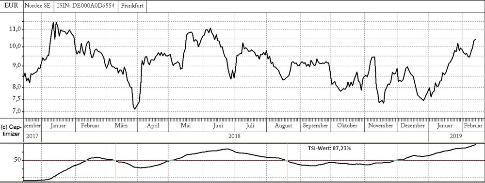2019 ist bisher das Jahr der Nordex-Aktie. Seit Anfang Januar konnte die Aktie gut 35 Prozent zulegen und notiert wieder im zweistelligen Kursbereich über der 10-Euro-Marke. Mittlerweile hat auch das TSI-System das Papier des Windanlagenbauers aus Norddeutschland wieder auf dem Radar.