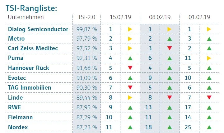 Der Grund für die jüngste Rallye der Nordex-Aktie ist klar. Der starke Auftragseingang Ende 2018 macht sich mittlerweile in den Kursen bemerkbar. Dank der massiven Aufwärtsbewegung konnte die Aktie den seit Mitte 2018 gültigen Abwärtstrend hinter sich lassen. Auch in der TSI Rangliste klettert die Aktie Position um Position nach oben. In den vergangenen Wochen konnte sich Nordex von Platz 25 auf Platz 18 und schließlich auf Platz 11 verbessern. Der TSI-Wert ist dabei kontinuierlich bis auf 87,23 Prozent gestiegen. Bei dem hohen Momentum der Aktie ist es nur noch eine Frage der Zeit, bis die 90-Prozent-Marke geknackt wird. Dann qualifiziert sich der Wert für einen Kauf in das TSI Depot. Dass Nordex für gute Gewinne sorgen kann, bewies der Titel bereits in den vergangenen Jahren, als er immer mal wieder zu den trendstärksten Aktien im HDAX zählte.