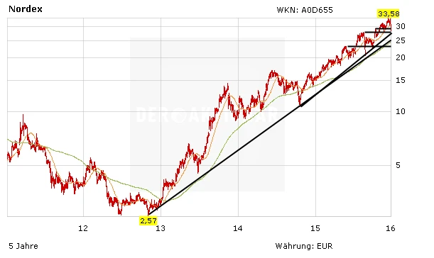 Sebastian Growe, Analyst der Commerzbank, glaubt aufgrund der jüngsten Nachrichten bezüglich der Auftragslage, der Vorstand von Nordex habe bei den Zielen für das Jahr 2015 wohl zu tief gestapelt. Deshalb rät er weiter dazu, die Aktie des auf Windkraftanlagen spezialisierten Unternehmens mit einem Kursziel von 40 Euro zu "Kaufen".