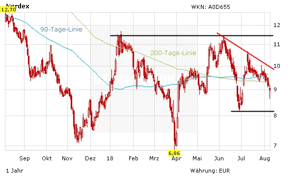 Noch im Juli glänzte Nordex mit Rekordaufträgen für neue Anlagen. Seitdem wurde es aber still um die Hamburger. Der Aktienkurs rutschte von 10,68 Euro am 10. Juli auf nur noch 8,70 Euro heute Morgen zurück. Zuletzt stabilisierte sich die Nordex-Notierung wieder bei knapp 9 Euro, gehörte aber immer noch zu den Tagesverlierern im TecDAX. Auch die 200-Tage-Linie - derzeit bei 9,32 Euro - wurde wieder nachhaltig unterschritten.
