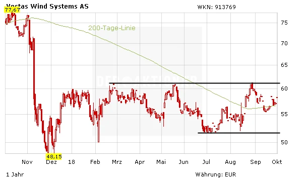 Die Vestas-Aktie "krebst" seit Monaten in einer Seitwärtsrange zwischen 380 und 450 Dänischen Kronen (bzw. gut 51 bis 61 Euro). Eine nachhaltige Trendwende aufwärts ist derzeit nicht absehbar. Anleger warten auf die Überwindung der oberen Linie.