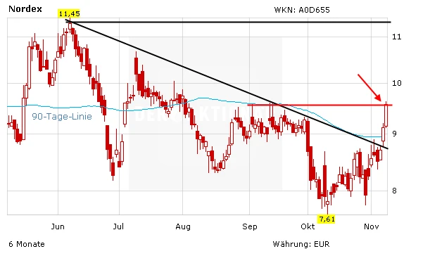 Und auch Nordex kletterte am Donnerstag zeitweise um gut vier Prozent auf 9,62 Euro (siehe Pfeil). Der Kurs hat damit eine wichtige Widerstandszone erreicht. Auf dem Niveau bei 9,60 Euro scheiterte die Nordex-Aktie mehrmals im Vormonat. Das Chartbild hatte sich zuletzt aufgehellt, als die Abwärtstrendlinie seit Juni sowie die 90-Tage-Linie knapp unter der 9-Euro-Marke überwunden werden konnten. Am Freitag rutschte die Nordex-Aktie wieder ab.