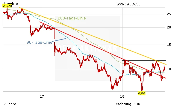 Die Nordex-Aktie schwingt sich am Donnerstag wieder über die 10-Euro-Marke, die seit vergangenem Herbst immer wieder mal eine Rolle spielte. Mehrfach ging es zwischen 6,86 und 11,70 Euro wild auf und ab. Charttechnisch würde sich die Lage verbessern, wenn die orange Abwärtstrendlinie bei knapp 11,00 Euro überwunden werden könnte. Vor allem das bisherige 2018er-Hoch bei 11,70 Euro stellt dann jedoch eine mächtige Chart-Hürde dar. Längerfristig orientierte Aktionäre warten noch ab. Zu ungewiss bleibt, inwieweit sich die höheren Umsatzzahlen auch in Gewinnen niederschlagen.