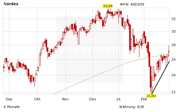 Durch das deutliche Kursplus eroberte die Nordex-Aktie die 200-Tage-Linie zurück. DER AKTIONÄR sieht im Wert noch reichlich Potenzial. Das Kursziel liegt bei 40.00 Euro.