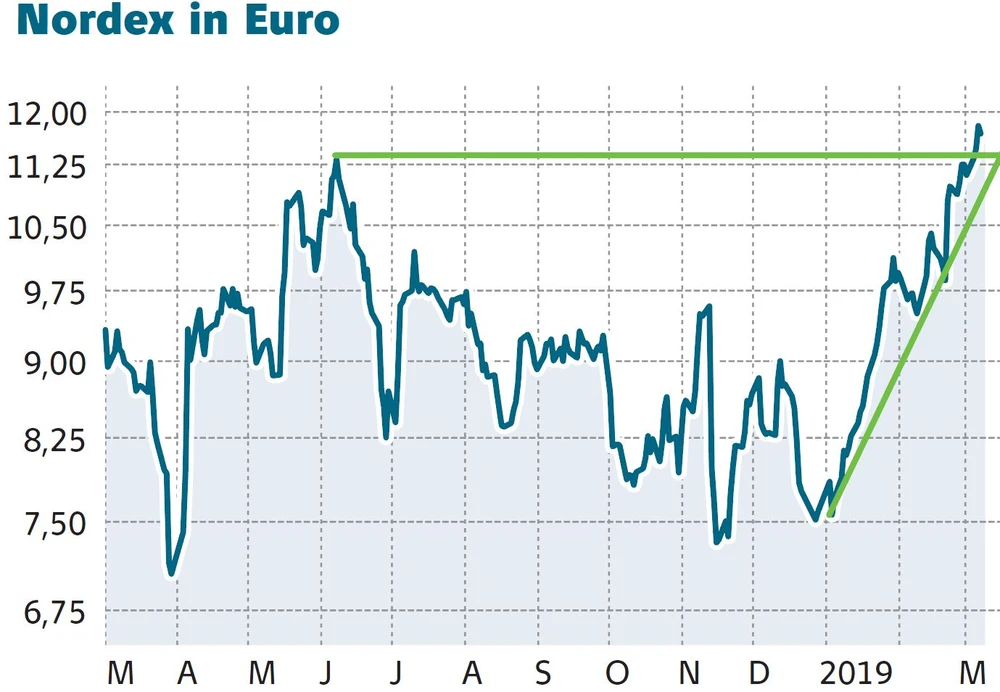Neue Aufträge in Europa haben die Nordex-Aktie über den Widerstand bei 11,50 Euro katapultiert. Seit Jahresbeginn hat der SDAX-Titel damit bereits über 50 Prozent zugelegt. Auch wenn die Luft nach der Mega-Rallye dünner wird, zeigt sich ganz klar: Windkraft ist nach schwierigen Jahren wieder gefragt.