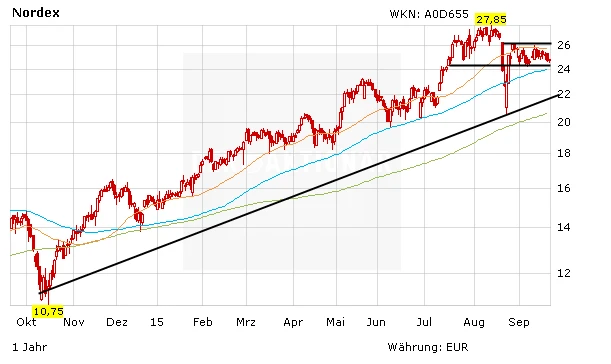 Der Newsflow bleibt positiv, die Aktie überzeugt nach wie vor durch Relative Stärke. Seit Ende August ist das Papier in den Seitwärtstrend übergegangen. Derzeit hängt das Papier bei rund 24,50 Euro fest. Hier verläuft auch die ansteigende 90-Tage-Linie. Investierte Anleger bleiben investiert.