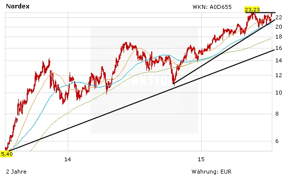 Zu Wochenbeginn startet die Nordex-Aktie durch. Gute Nachrichten verhalfen dem Papier zu einem Sprung auf den höchsten Stand seit Herbst 2008. Der Windanlagenhersteller hatte im Vorfeld einen neuen Auftrag aus Frankreich bekannt gegeben.