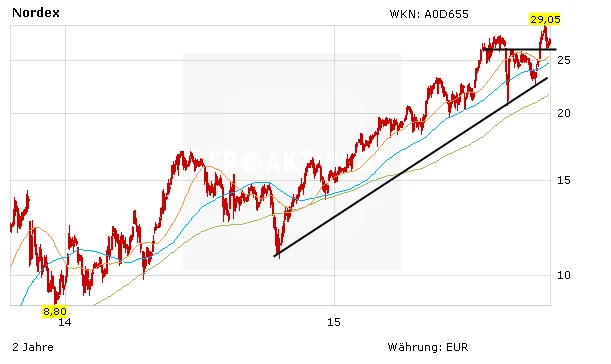 Der Newsflow bleibt wie erwartet positiv. Das sollte sich auch bis zum Jahresende hin fortsetzen: Die Analysten haben zuletzt ihre Kursziele nach oben geschraubt. Goldman Sachs: 35 Euro, Société Générale sieht das Papier von Nordex bei 32 Euro fair bewertet. DER AKTIONÄR geht davon aus, dass die Aktie den nächsten Stop bei 32,67 Euro einlegen wird. Hier verläuft ein Widerstand aus dem Jahr 2008. Anleger bleiben investiert!