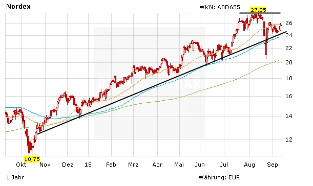 Kurzum: Der Windanlagenbauer liegt sehr gut im Rennen. In der kommenden Woche startet die wichtige Branchenmesse Husum Wind 2015 (15. September bis 18. September). Gut möglich, dass in diesem Zeitraum die eine oder andere gute Nachricht von Nordex über die Ticker läuft. Die Aktie sieht nach wie vor technisch sehr gut aus. Anleger bleiben investiert. Neues Potenzial ergibt sich, wenn das Papier die Marke von 27,85 Euro nach oben überwindet.