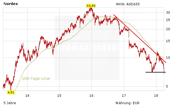 Die Nordex-Aktie stürzt daraufhin am Mittwoch hemmungslos ab. Selbst das 2017er-Tief bei 7,09 Euro hielt als technische Unterstützung nicht. Bis auf 6,87 Euro rauschte der Wert nach unten - der tiefste Stand seit Sommer 2013. Auch die gestrige Hoffnung auf eine Trading-Chance erfüllte sich nicht. Der Titel wurde bei 7,05 Euro ausgestoppt.