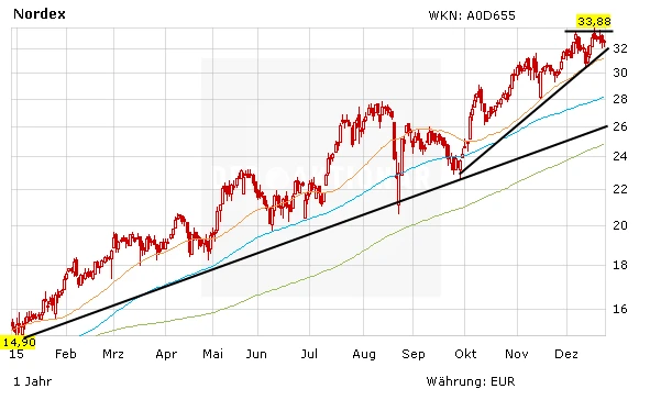 Hinzu kommt: Nordex hat die Weichen für weiteres Wachstum gestellt und eine neue Avalkreditlinie in Höhe von 950 Millionen Euro abgeschlossen "Bei der Auswahl der Banken haben wir darauf geachtet, dass diese ein gutes Rating besitzen und in der Lage sind, die erweiterte regionale Ausrichtung der Gruppe in Schwellen- und Entwicklungsländern zu begleiten", sagt Nordex- Finanzvorstand Bernard Schäferbarthold. Die Gewinndynamik sollte in den nächsten Quartalen anhalten, ebenso wie der positive Newsflow. DER AKTIONÄR hat vor kurzem das Kursziel auf Sicht von zwölf Monaten auf 40 Euro angehoben.