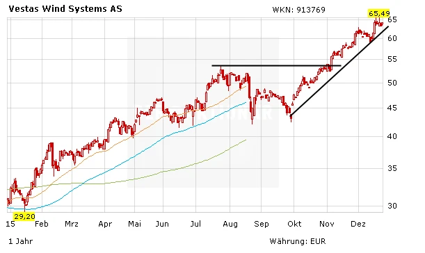 Auch Brancheriese Vestas hat im Jahr 2015 ganz hervorragend abgeschlossen. Die Aktie ist erneut einer der Überflieger unter den Titel aus dem Sektor der erneuerbaren Energien. 110 Prozent Zuwachs bei der Aktie können sich sehen lassen. Und der Trend zeigt weiter nach oben. Allen voran durch die Tatsache, dass die USA die Förderung für Solar- und Windkraft verlängert haben, wird Branchenriese Vestas weiter profitieren. Wer investiert ist, bleibt auf jeden Fall dabei!