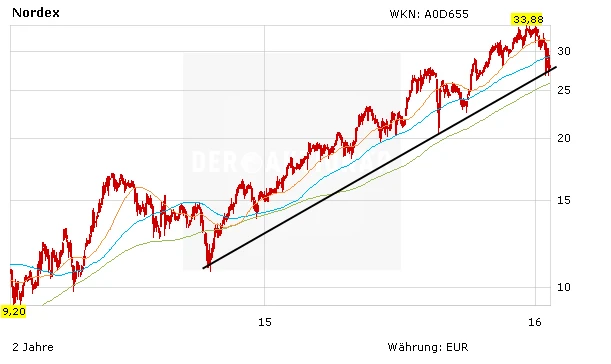 Charttechnisch hat sich das Bild bei Nordex wieder etwas eingetrübt. Es ist durchaus möglich, dass das Papier nun das schlimmste hinter sich hat. Aktuell sieht es nicht danach aus, dass die Aktie in den Bereich von 25,80 Euro zurück fällt. Hier verläuft die 200-Tage-Linie. Erste Käufe sind auf diesem Niveau vertretbar.