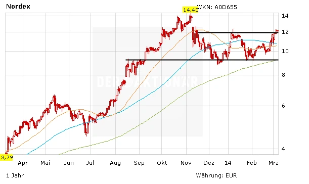 Wenig Beachtung unter den Anlegern findet das Papier der spanischen Gamesa. Dabei ist die Firma deutlich besser aufgestellt als zum Beispiel Vestas. Die Spanier sind in den zukünftigen Wachstumsmärkten gut positioniert. In Lateinamerika hat Gamesa in den ersten drei Quartalen 2013 über die Hälfte der Windräder verkauft. Zudem hat Vorstand den Marktanteil in Indien weiter ausgebaut. Daneben betreibt Gamesa (WKN A0B5Z8) sogar eigene Windparks. Ziel ist es mit dem margenstarken und von Kontinuität geprägten Geschäft die Schwankungen beim Verkauf der Windturbinen auszugleichen. Auch aus charttechnischer Sicht hinterlässt das Papier einen starken Eindruck.