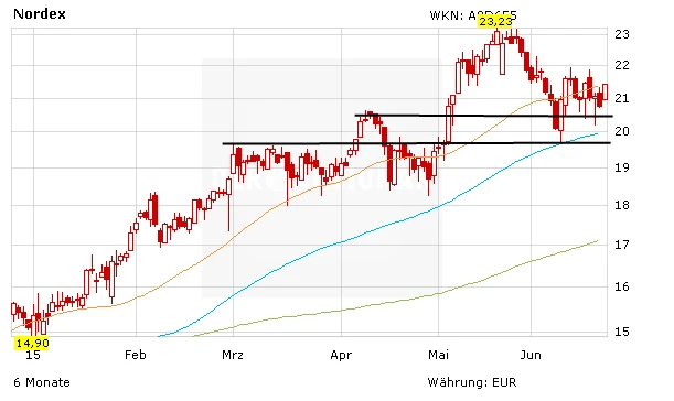 Die Nordex-Aktie liegt trotz eines schwachen Gesamtmarktes nach wie vor hervorragend im Rennen. Nach einem Zwischenspurt und einem Hoch bei 23,25 Euro, korrigierte das Papier bis knapp unter 20,00 Euro. Auf diesem Niveau hat sich ohnehin ein horizontaler Widerstand ausgebildet. Anleger bleiben gelassen, schließlich sehen die Schätzungen für die nächsten Jahre vielversprechend aus.
