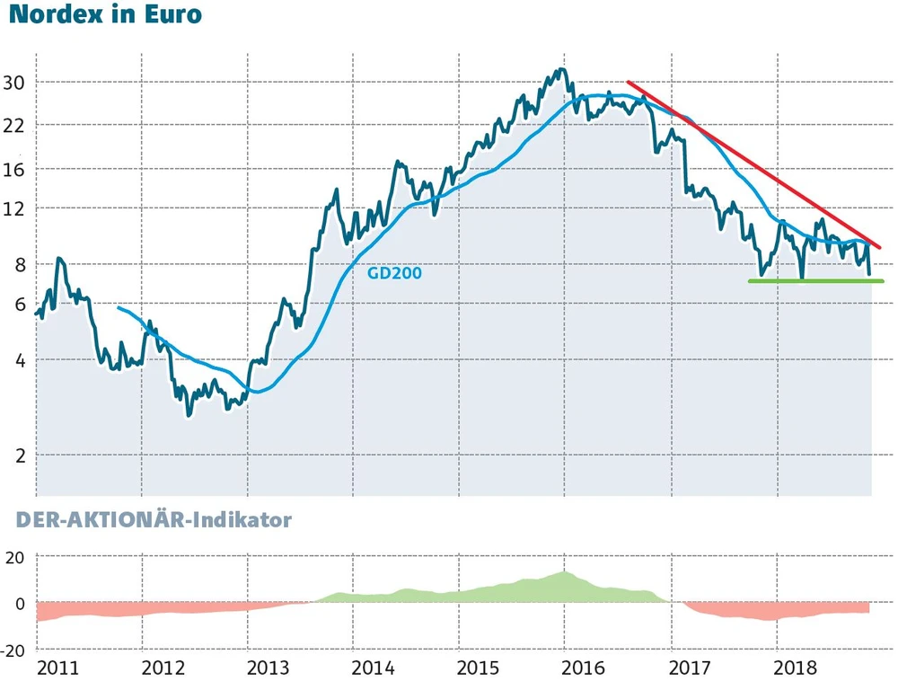 Der Chart der Nordex-Aktie zeigt, dass die Unterstützung bei 7,00 Euro nun wieder in Reichweite kommt. Dort drehte der TecDAX-Wert bereits im November 2017 und im Frühjahr 2018 wieder aufwärts. Ohne fundamental gute Signale dürfte es mit einer Verteidigung der Marke diesmal allerdings schwer werden. Dann wartet bei etwa 6,50 Euro noch eine kleinere technische Unterstützung aus dem Jahr 2013. Darunter kämen die Tiefstände aus dem Jahr 2012 wieder in Betracht, als der Nordex-Kurs zeitweilig die Marke von 3 Euro unterschritten hatte.