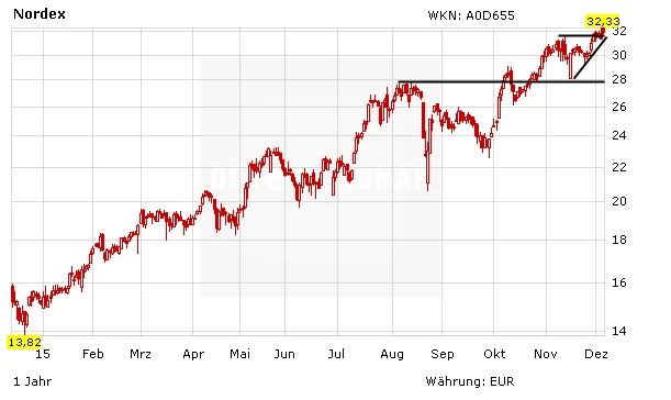 Die Aktie des Windanlagenherstellers Nordex hat ihren Inhabern im laufenden Jahr wieder einmal sehr viel Freude gemacht. Zuletzt markierte der TecDAX-Titel weitere Höchststände. Die laufende Rekordjagd dürfte sich nach Ansicht der Experten des Analysehauses Warburg Research allerdings nicht ohne Unterbrechung fortsetzen.