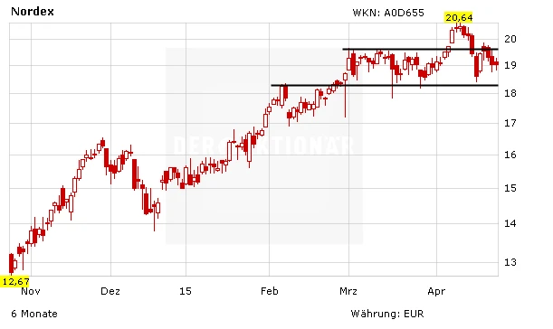 Die jüngste Korrekturbewegung an den Märkten machte einem nachhaltigen charttechnischen Ausbruch der Nordex-Aktie vorerst einen Strich durch die Rechnung. Statt weiter Kurs Richtung 22,50 Euro aufzunehmen, legte Nordex vorerst den Rückwärtsgang ein. Die Ausbruchslinie bei 19,62 Euro hat ebenso wenig als Unterstützung gehalten, wie auch der kurzfristige Aufwärtstrend bei 19,28 Euro. Derzeit notiert die Nordex-Aktie bei 19,06 Euro. Anleger lassen sich von dem aktuellen Rücksetzer aber nicht aus der Ruhe bringen, sondern nutzen die Kurse, um die bestehende Position auszubauen! Unterstützungen liegen jetzt bei 18,20 (Hoch aus dem Monat März 2015) sowie bei 16,50 Euro (Hoch: Dezember 2014). Für beide Marken werden Abstauberlimits am Markt platziert.