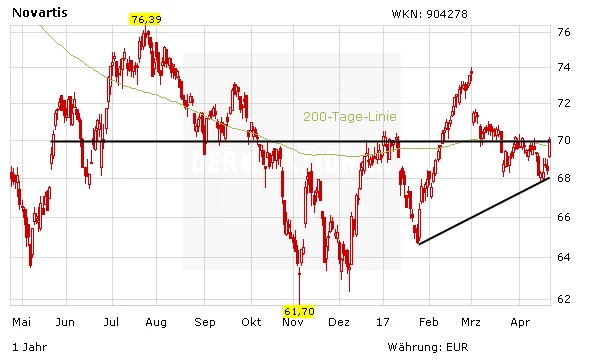 Ein erster Schritt ist getan: Mit dem heutigen Kurssprung durchbricht die Novartis-Aktie die 200-Tage-Linie nach oben und generiert ein neues Kaufsignal. Gelingt ein nachhaltiger Sprung über die Hürde um die 70 Euro, könnten Anschlussgewinne bis auf 74 Euro folgen, ehe das 52-Wochen-Hoch bei 76,39 Euro in den Fokus rückt. Für langfristig orientierte Anleger bietet sich die Novartis-Aktie nach den soliden Quartalszahlen und dem charttechnischen Impuls zum Kauf an.