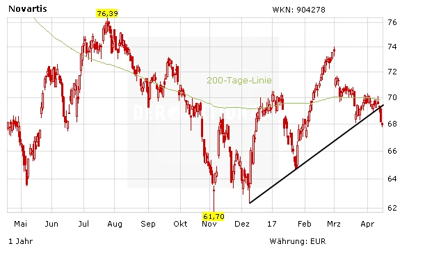 Die Aktie von Novartis kommt unterdessen nicht vom Fleck. Den Kampf um die 200-Tage-Linie hat das Papier vorerst verloren. Neueinsteiger sollten einen nachhaltigen Sprung über diese Chartmarke abwarten.
