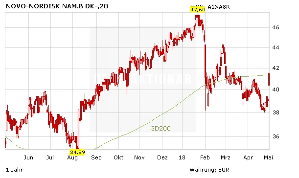 Was für ein Comeback der Aktie von Novo Nordisk. Nachdem es zuletzt nachrichtentechnisch recht ruhig um den Wert geworden war, hatten Gewinnmitnahmen den Kurs belastet. Mit Bekanntgabe der Zahlen für das erste Quartal konnte Novo Nordisk aber einen kräftigen Kurssprung von mehr als sechs Prozent verbuchen. Damit befindet sich die Aktie knapp vor der Rückeroberung der 200-Tage-Linie, was ein erneutes Kaufsignal bedeuten würde.