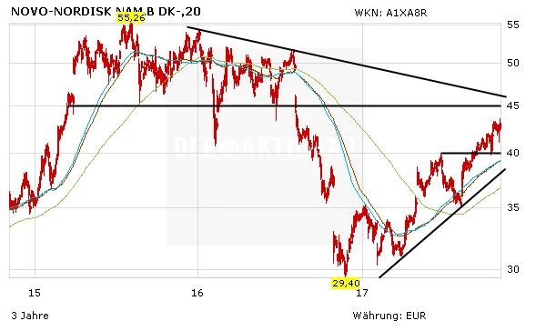 Die Entwicklung von Novo Nordisk sieht die Société Générale (SocGen) hingegen wesentlich kritischer. Analyst Florent Cespedes hält an seiner Verkaufsempfehlung trotz einer Kurszielanhebung von 200 auf 212 Kronen fest (rund 28,50 Euro), Das große Abwärtspotenzial begründet Cespedes mit der verfehlten Umsatzprognose im dritten Quartal. Dennoch hob er seine Ergebnisschätzungen für die Jahre 2017 und 2018 an.