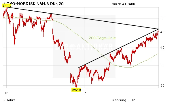 Novo Nordisk hat in diesem Jahr unter Beweis gestellt, sich in einem schwierigen Marktumfeld zu behaupten. Mit einigen Zulassungs- und Studienerfolgen stellt der dänische Konzern zudem die Weichen für die Zukunft. Die Börse hat das Comeback von Novo Nordisk honoriert: Seit Jahresbeginn beträgt das Kursplus an der Heimatbörse in Kopenhagen 36 Prozent. DER AKTIONÄR geht davon aus, dass sich die positive Entwicklung im kommenden Jahr fortsetzt und die Papiere von Novo Nordisk die alten Höchststände aus dem Jahr 2016 ansteuert. Investierte Anleger geben kein Stück aus der Hand. Rücksetzer bleiben Kaufgelegenheiten. Im Hebel-Depot, das Sie hier abrufen können, setzt DER AKTIONÄR mit dem Mini-Long mit der WKN SC5CPW auf weiter steigende Kurse der Novo-Aktie.